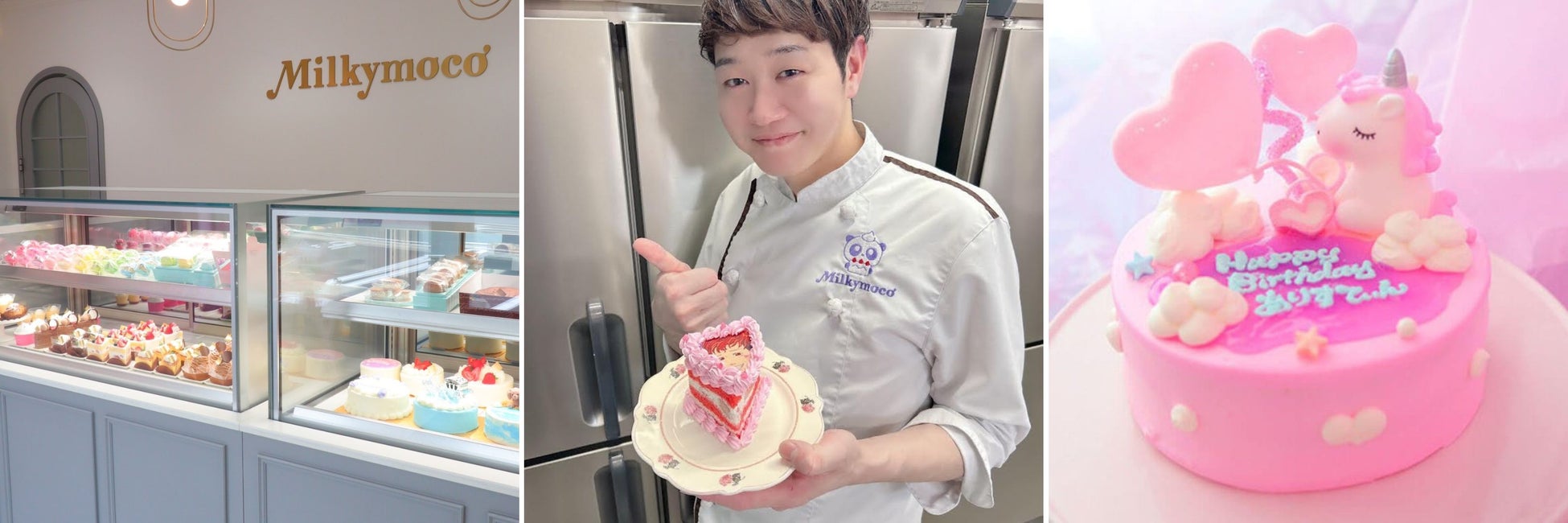 愛知県で夫婦で営む「Milkymoco」は、2013年9月に完全オーダーのお店としてスタート。可愛くて美味しいと口コミで広まり、予約がなくても買える店舗として進化、2023年4月に今の店舗に。オーナーパティシエであるご主人は、お客様が思う想像の一歩先の美味しさを追求。奥様は、可愛くときめくケーキのデザインを追求。夫婦それぞれの強みを生かし、現在50種類以上のデザインを販売。リピートのお客様も多い人気店に。
