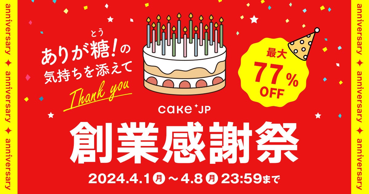 ケーキ・スイーツ専門通販サイト「Cake.jp(ケーキジェーピー)」を運営する株式会社Cake.jp(本社:東京都新宿区、代表取締役:高橋 優貴)は、創業15周年記念として、日頃のご愛顧に『ありが糖(とう)!の気持ちを添えて』、2024年4月1日(月)12:00から4月8日(月)23:59まで、最大77%オフのセールなどお得な企画が目白押しの創業感謝祭を開催します。